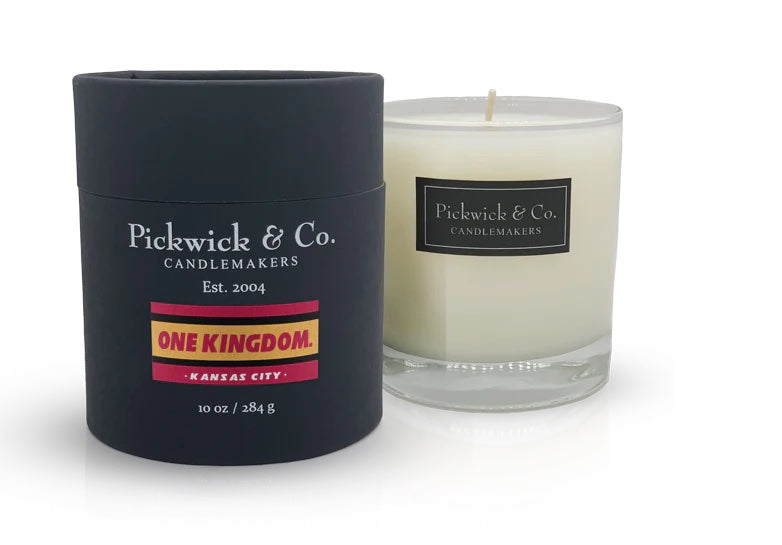 Experience the bold power of Kansas City Chiefs spirit with the One Kingdom Pickwick Candle. Artfully crafted from crushed tobacco, patchouli, amber, sandalwood and tonka bean, this luxuriously scented candle will both invigorate and inspire. Light it, and be ready to be taken away to One Kingdom!