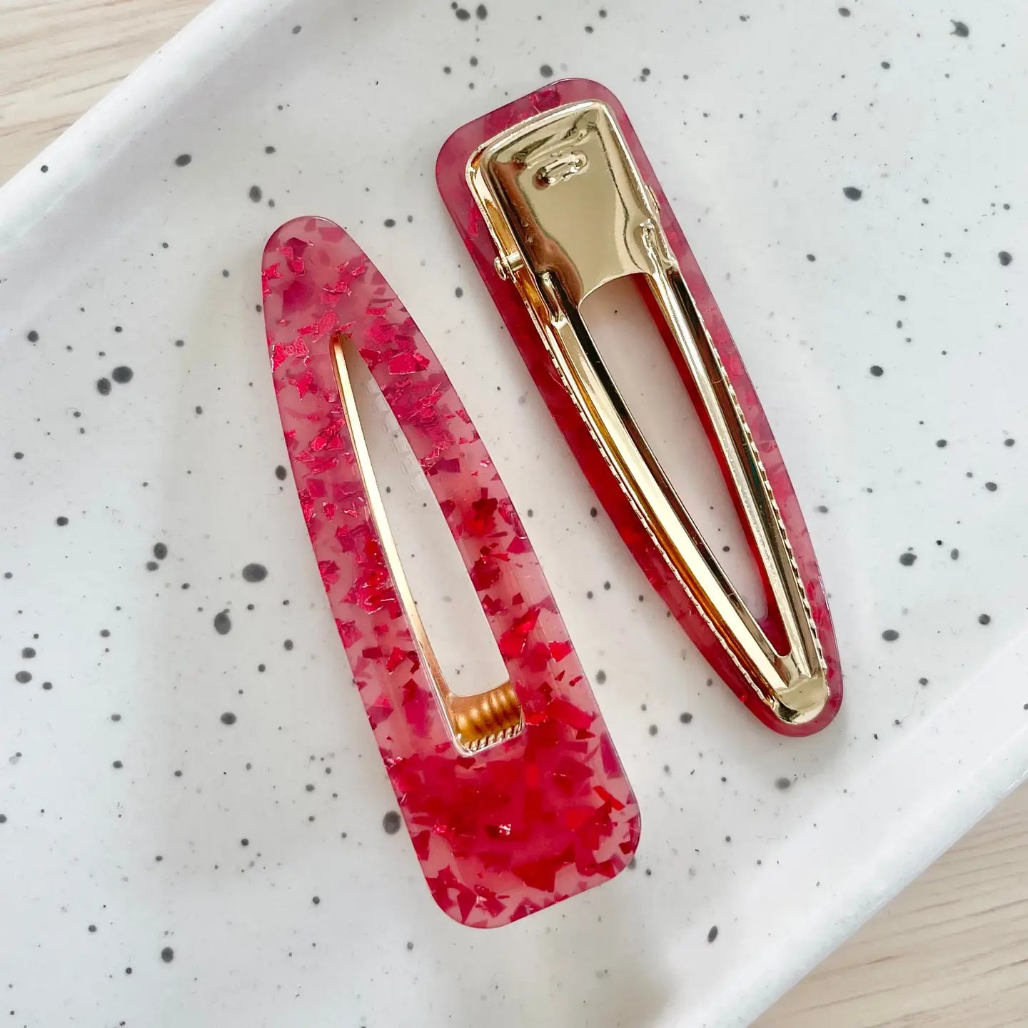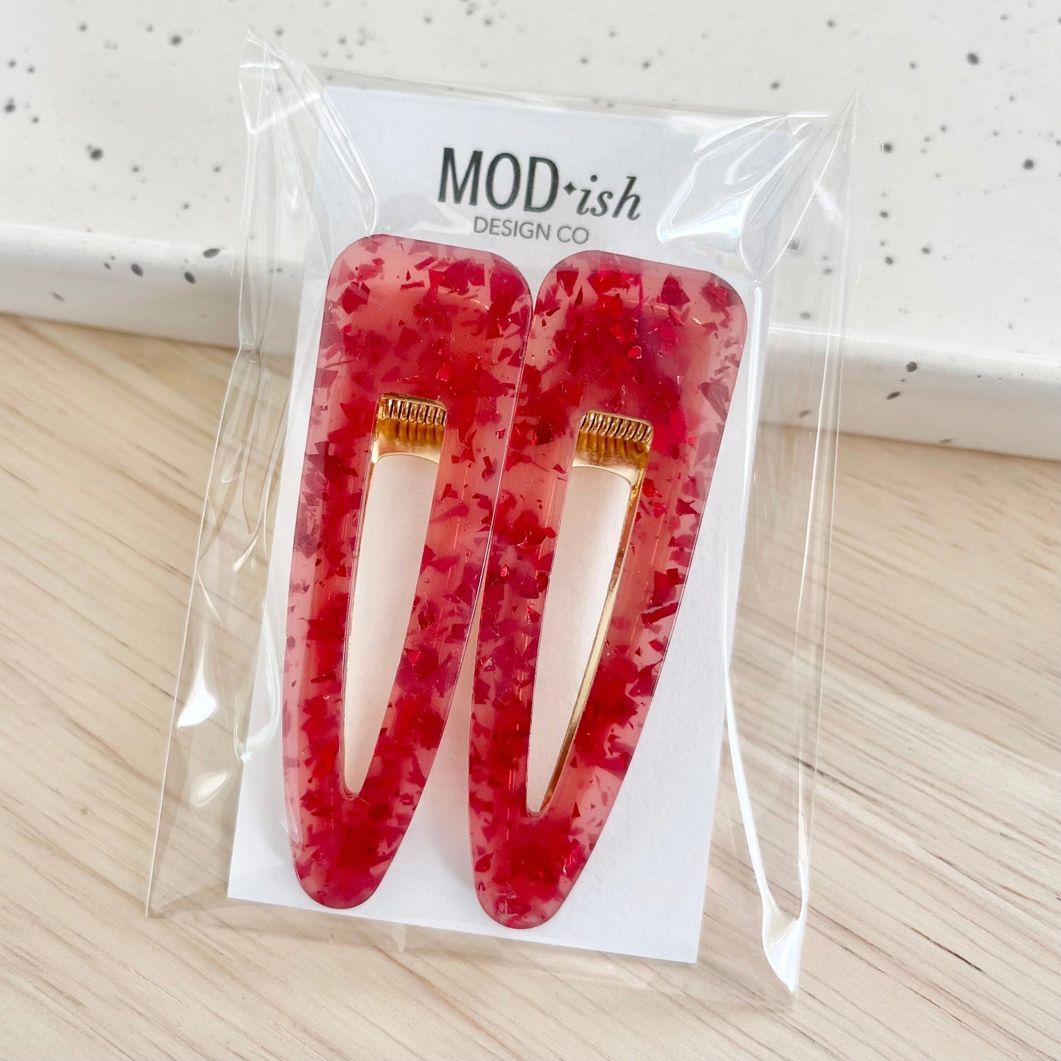 This playful Red Confetti Alligator Clip is a quirky way to add some flair to your hair. Made with acrylic, this 2.75 inch long clip will securely hold your locks in place while also making a statement. Upgrade your hair game with this fun accessory!