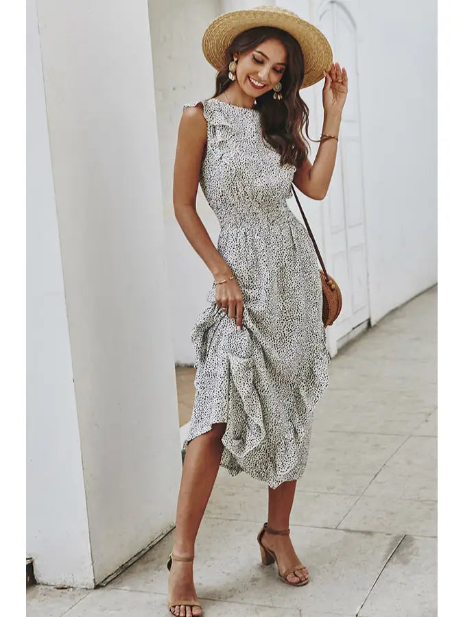 This ruffled mid calf dress with its black and cream polka dot design will be a new summer favorite! Lightweight and perfect for a casual summer day or a evening out.