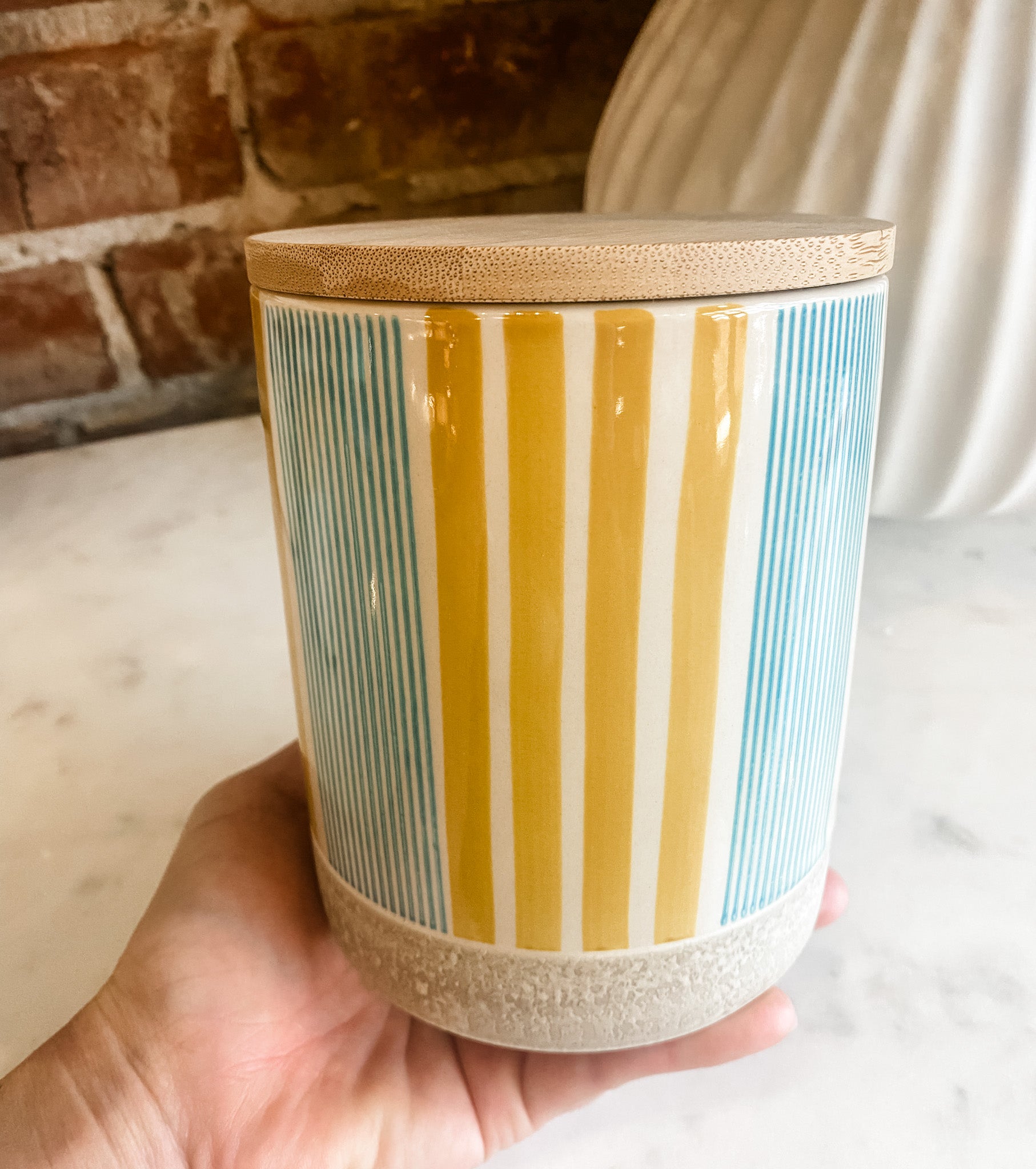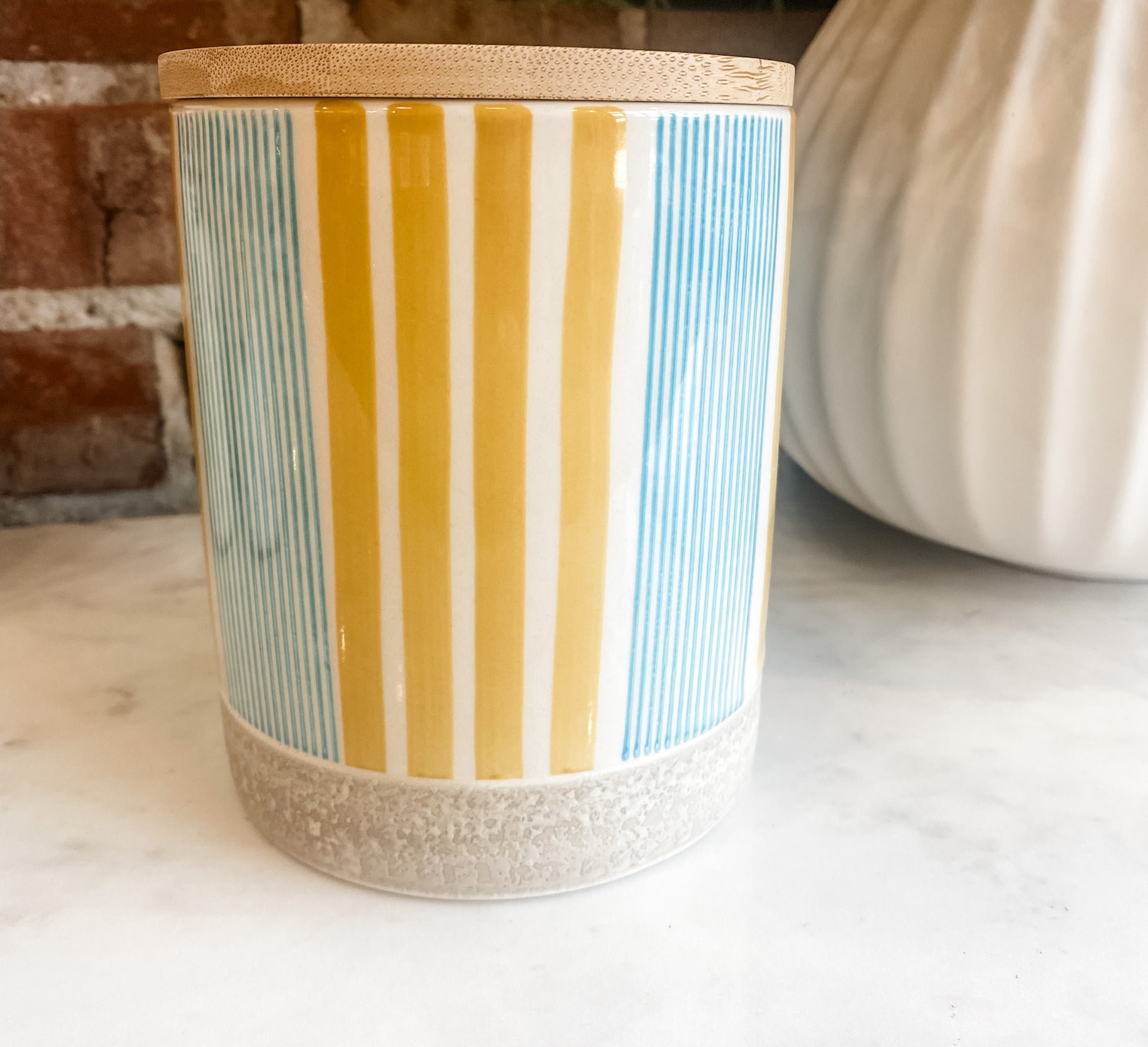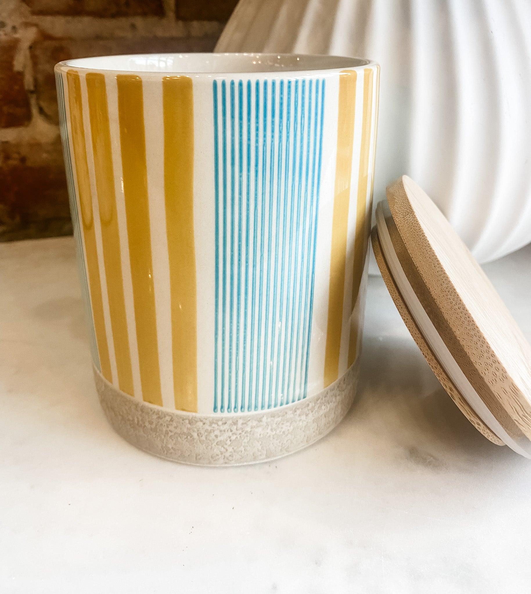 Storage with style: our small stoneware tins with their chic bamboo lid are an eye-catcher in the kitchen and bathroom. Spices, tea or cotton pads and jewellery, everything is safely stored in our storage tins in fresh colours with the trendy striped pattern. Combine our tins in different colours and sizes and create highlights in your home.