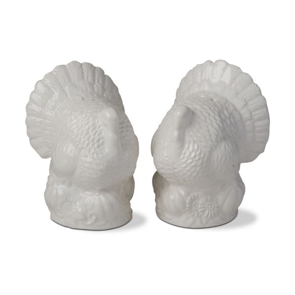 salt & pepper shakers are essential to any kitchen. this set is made from earthenware, featuring adorable turkey designs with highly sculpted details on an organic body. perfect accents for the fall season and any autumn-themed tablescape. packaged in an attractive acetate box, salt & pepper sets are great for gifting!